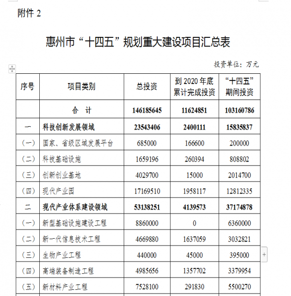 6月3日,惠州市政府正式對(duì)外公布《惠州市國民經(jīng)濟(jì)和社會(huì)發(fā)展第十四個(gè)五年規(guī)劃和2035年遠(yuǎn)景目標(biāo)綱要》(下稱《綱要》)。其中明確提出,“十四五”期間規(guī)劃建設(shè)重大項(xiàng)目312宗,計(jì)劃總投資近1.5萬億元,“十四五”期間計(jì)劃投資10316億元。