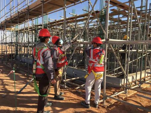 在進入施工現場前,項目部還將國內班前教育模式帶到沙特,并創新加入班前早班環節,“百人”齊開安全早班會,提高工人的安全意識與能力。在施工中,項目部采取了很多有效措施****限度保障安全。在當地臨邊防護的基礎上,加設了標準化防護欄桿;腳手架通道口安裝懸掛紅、黃、綠牌,按50個作業工人配置一個安全員進行安全管理,堅決阻攔無關人員、PPE佩戴不齊全人員進出腳手架進行作業,保障六個站點來自中國、巴基斯坦、印度、孟加拉、尼泊爾等八百多現場勞務人員作業安全……